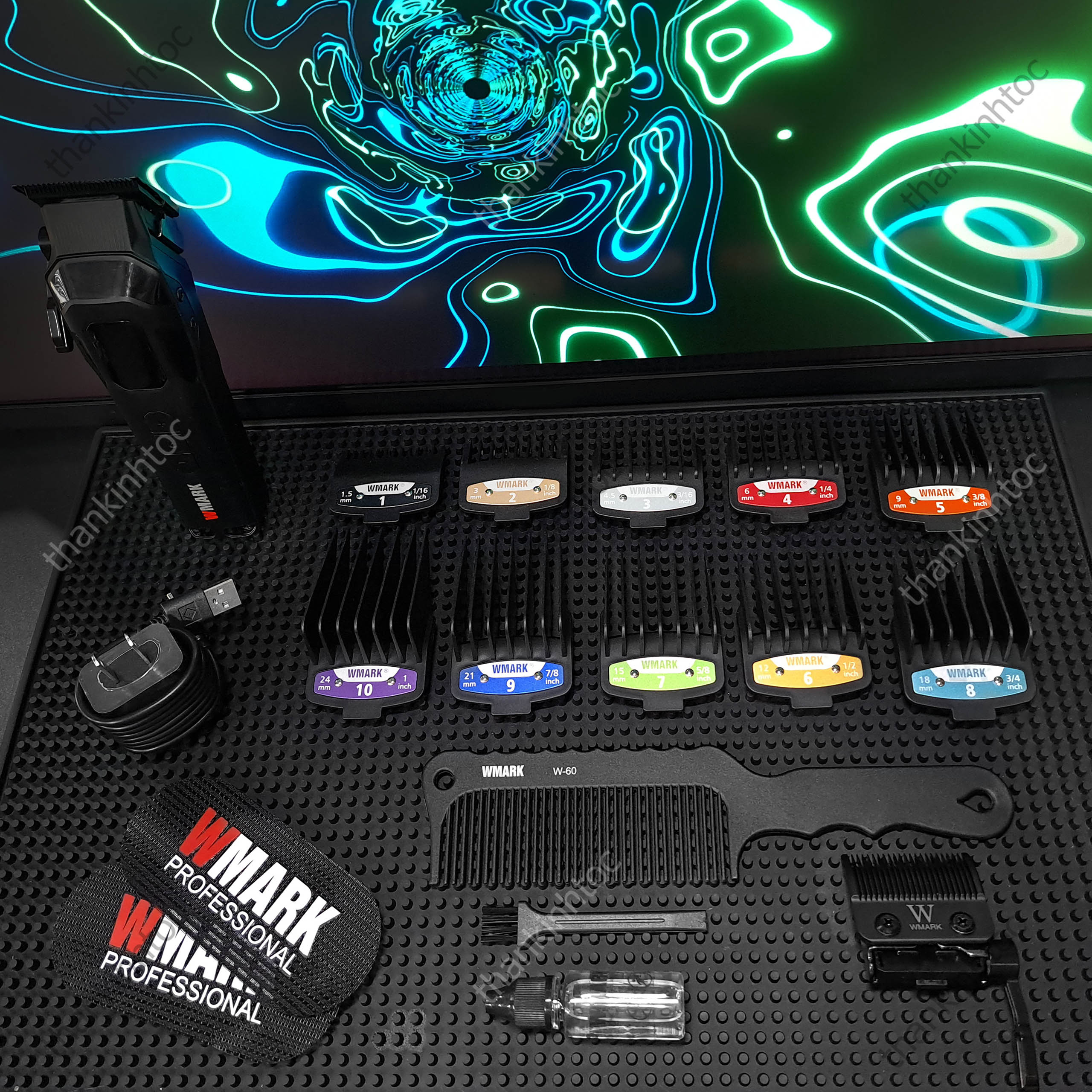 • Phụ kiện: 10 cữ gá thép (1,5/3/4,5/6/9/12/15/18/21/24mm), 1 lược bản to, 1 dầu tra, 1 chổi vệ sinh, 2 gai dán tóc và 1 cáp sạc USB, được tặng kèm thêm 1 bộ lưỡi đơn taper.