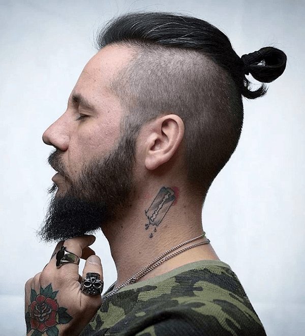 Nếu các chàng sở hữu gương mặt góc cạnh và đang phải “đau đầu” tìm kiếm một kiểu tóc phù hợp với mình thì giờ đây đã không còn phải lo lắng với kiểu tóc buộc cực “chất” này. Phái mạnh sẽ nuôi tóc hơi dài, sau đó vuốt ngược ra sau và buộc túm lên, vô cùng nam tính và cuốn hút.